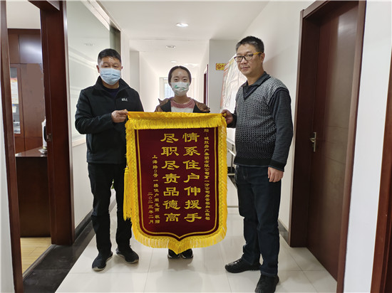 2月20日上午,上海路9号的周女士来到bat365在线登录入口(中国)官方网站第一分bat365在线登录入口(中国)官方网站,将一面印有“情系住户伸援手 尽职尽责品德高”的锦旗送到工作人员手中,衷心感谢bat365在线登录入口(中国)官方网站房管人员、工程维修人员,高效及时帮助其解决家中下水管道油污堵塞问题,对他们认真负责的工作态度和为住户排忧解难的敬业精神表示由衷的肯定及感谢。