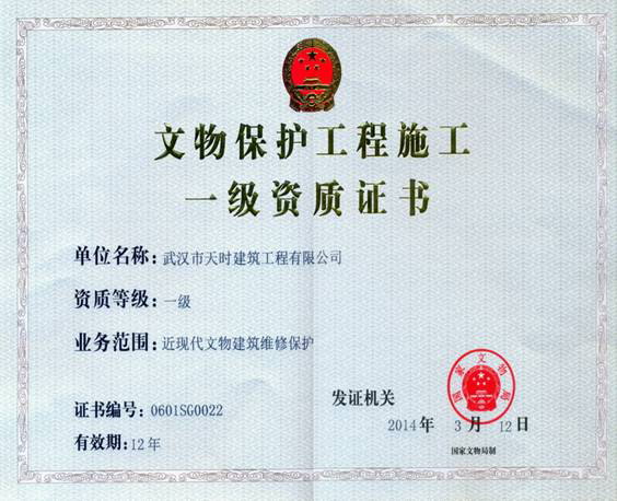 武汉市天时建筑工程有限bat365在线登录入口(中国)官方网站荣升为文物保护工程施工壹级资质
