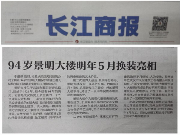 近期,长江日报、长江商报、武汉晨报等多家本地媒体相继对天时bat365在线登录入口(中国)官方网站黄鹤楼、园博园“汉口里”、景明大楼等古建修复、外装工程项目进行报道。充分肯定天时bat365在线登录入口(中国)官方网站在古建修复方面的精湛技艺,及为提升城市历史文化品味作出的不懈努力。